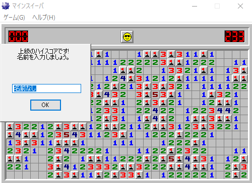 マインスイパー4 2018/2/5 パソコンソフト, 日記 まだ懲りずにマインスイパーにはまっている。 広告 ハイスコアー更新 何とか200秒台が出せた。 比較的空欄の個所が多いゲームと思われるが,なかなかの出来だと思う。 広告 ロ 次は 現在,次の目標として100秒台を設定し挑戦を続けている。 広告